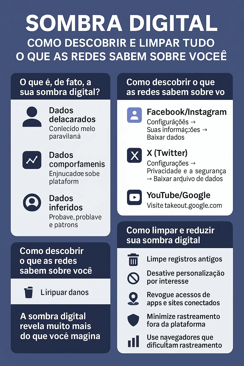 A maioria das pessoas acredita que controla minimamente sua privacidade online apenas ocultando o perfil, reduzindo interações ou ajustando configurações de segurança. Mas existe um segundo nível de exposição muito mais profundo e pouco conhecido: aquilo que chamamos de sombra digital. A sombra digital representa todo o conjunto de informações coletadas pelas redes sociais sem … Ler mais